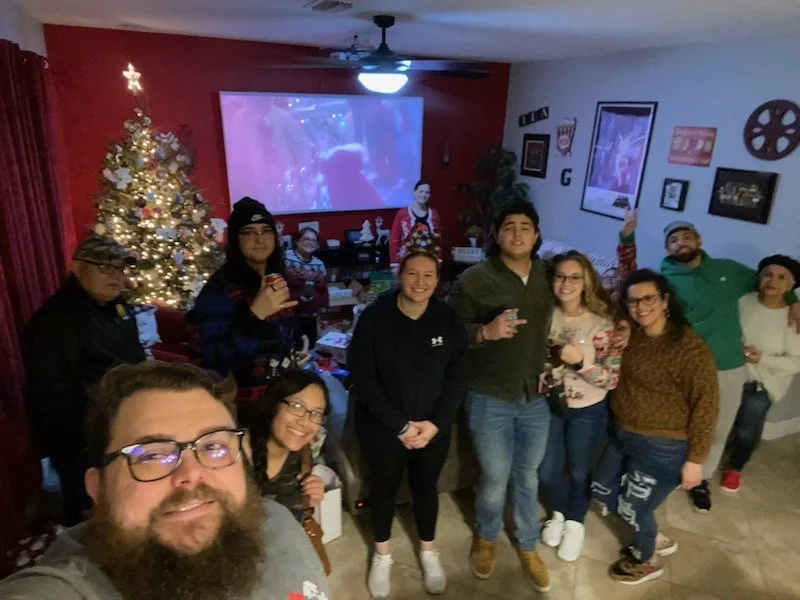 A group of people gathered in a living room, smiling and posing for a photo. A decorated Christmas tree is in the corner, and a TV displays a festive scene. The room is decorated with holiday items and cheerful décor.