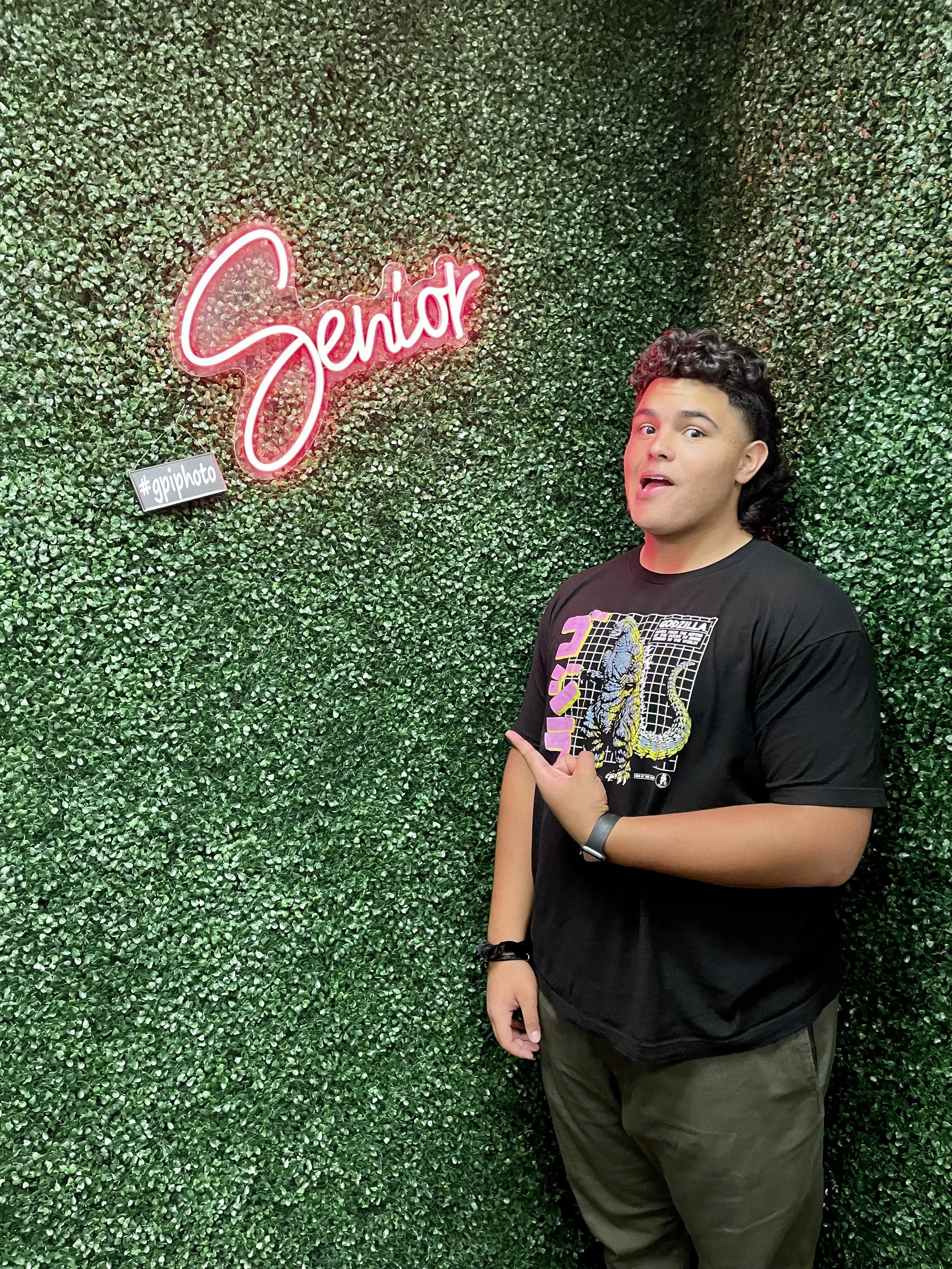 Person standing next to a neon sign saying 'Senior' on a green foliage wall, pointing and making an expression.