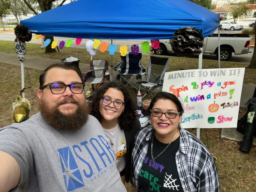 Three people smiling in front of a colorful booth at an outdoor event. The booth has a blue canopy, decorations, and a sign reading 'Minute to Win It!' offering games and prizes. Trees and vehicles are visible in the background.