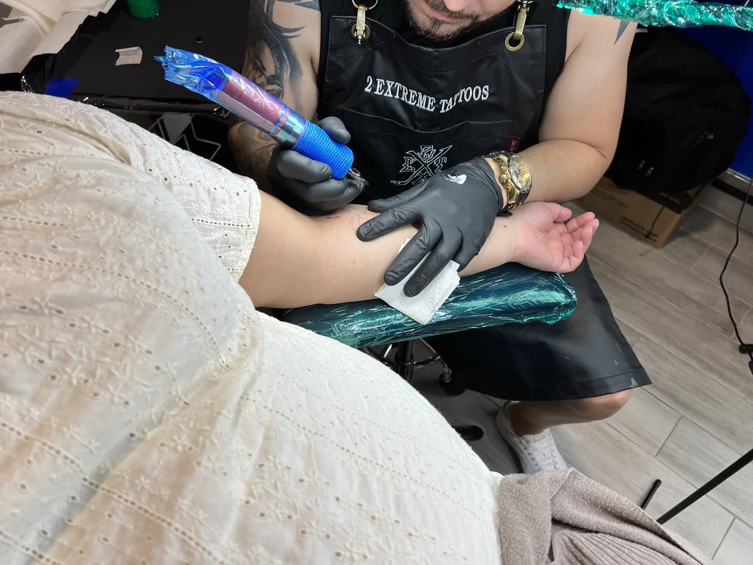 Tattoo artist in tattoo parlor applying a tattoo on a person's arm, wearing gloves and using a tattoo machine.