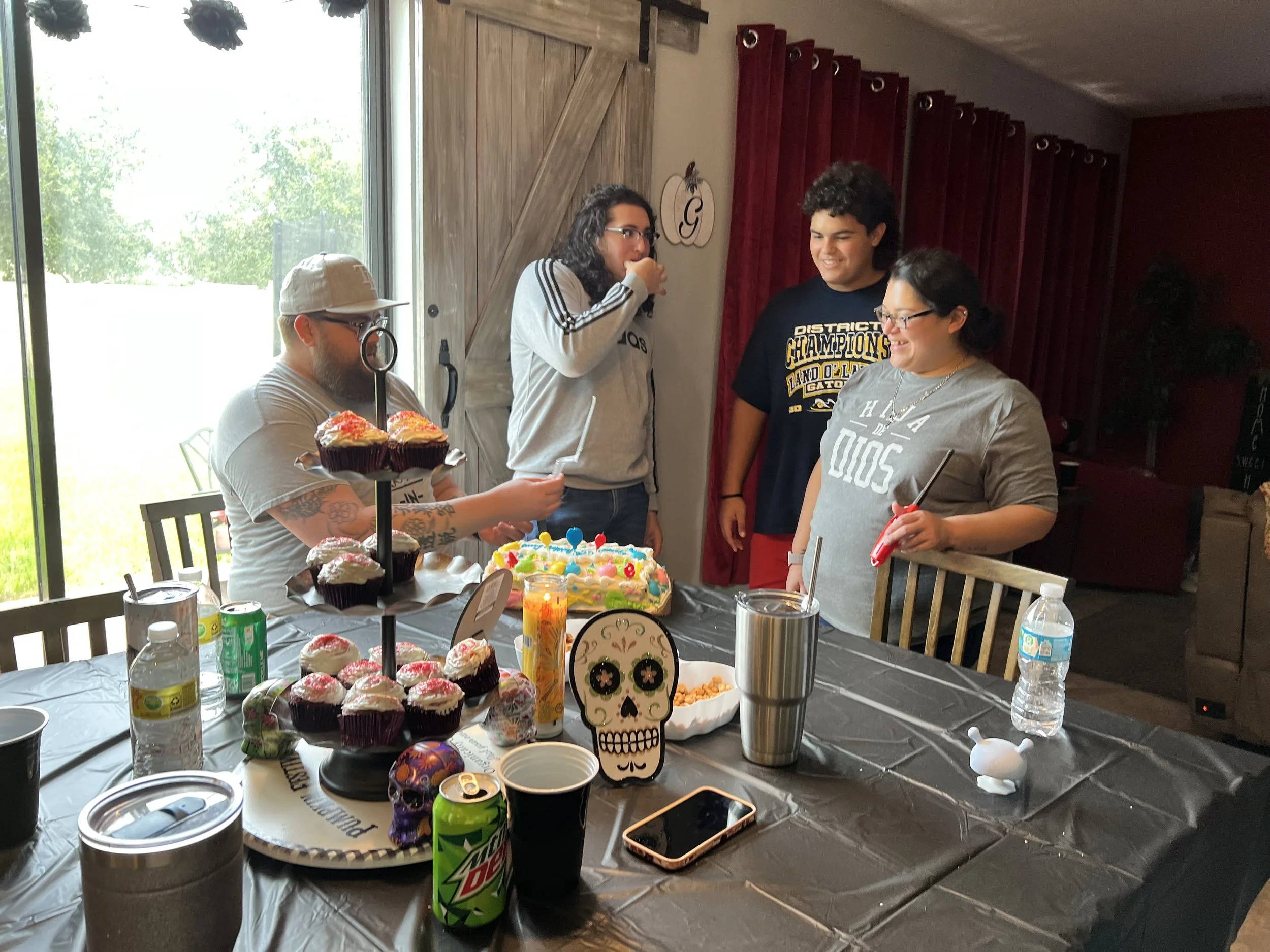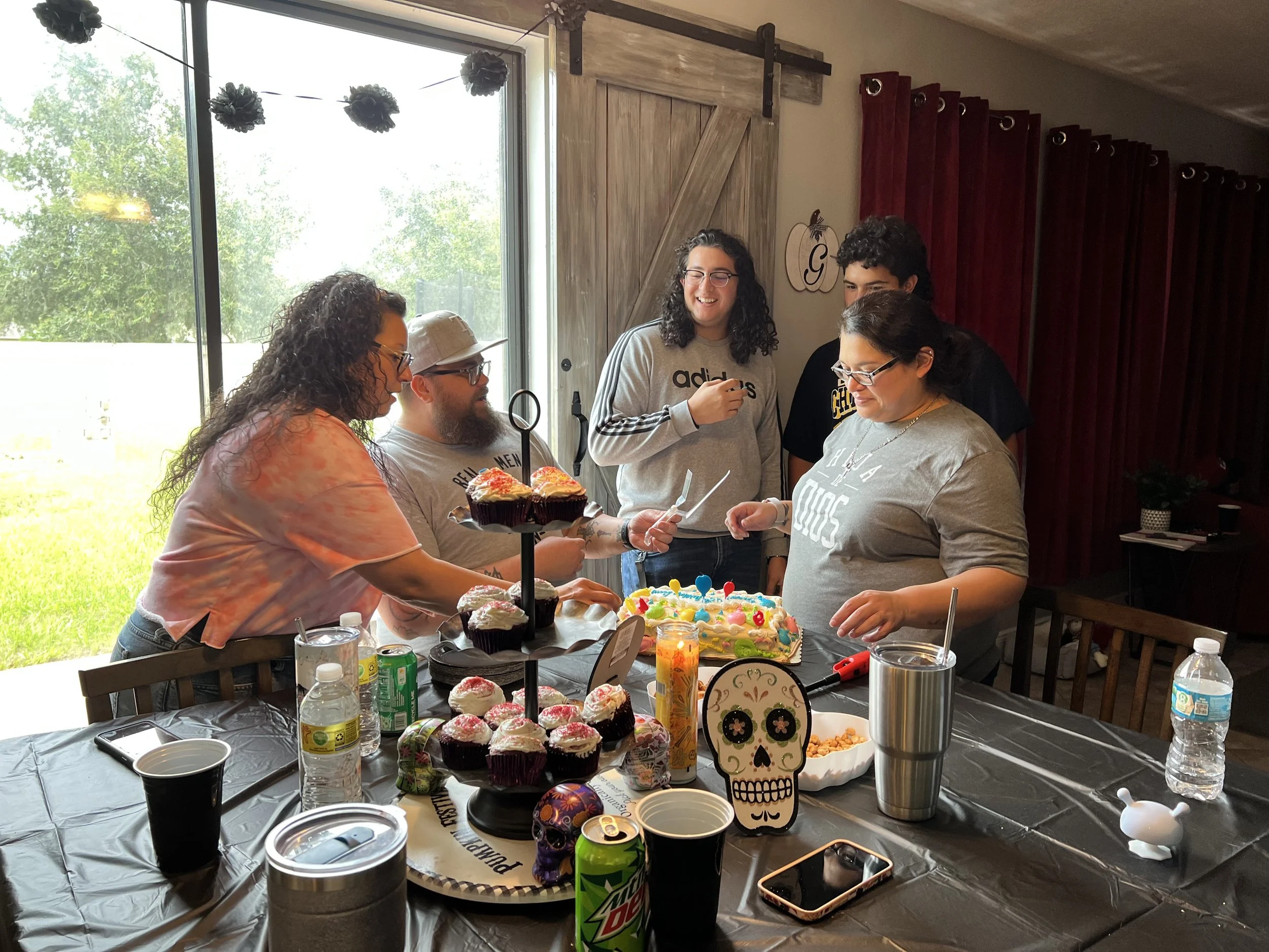 Group of people gathered around a table with cupcakes and a decorated cake, celebrating indoors with a black tablecloth and themed decorations.