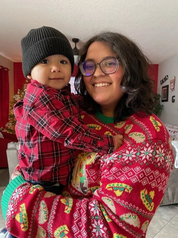 Person holding a baby, both smiling, indoors, with a holiday-themed sweater and a plaid shirt.