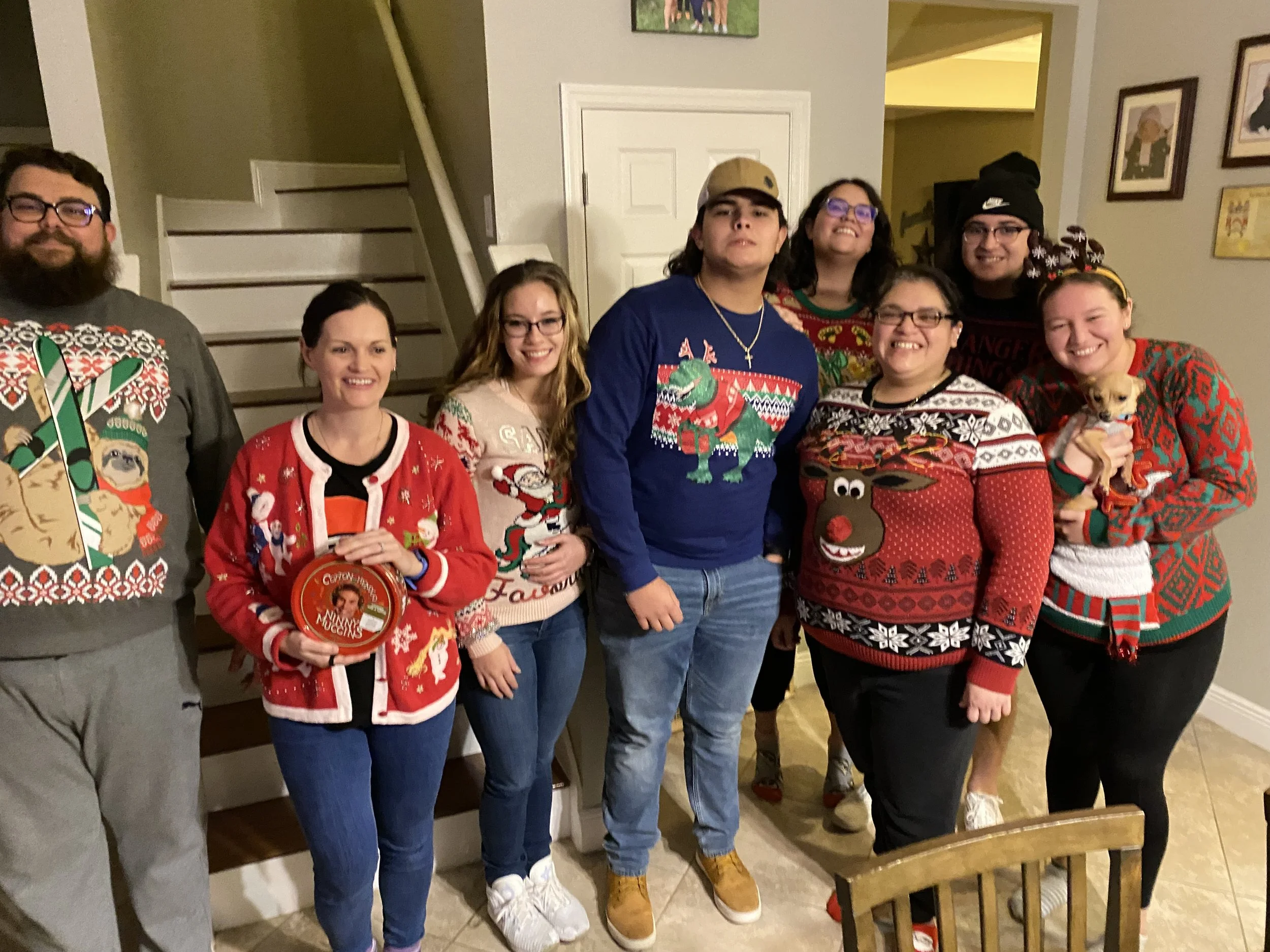 Group of people in Christmas sweaters posing indoors. One person holds a small dog wearing a sweater. Another person is holding a tin. There are several festive decorations on their sweaters, and they are smiling at the camera.