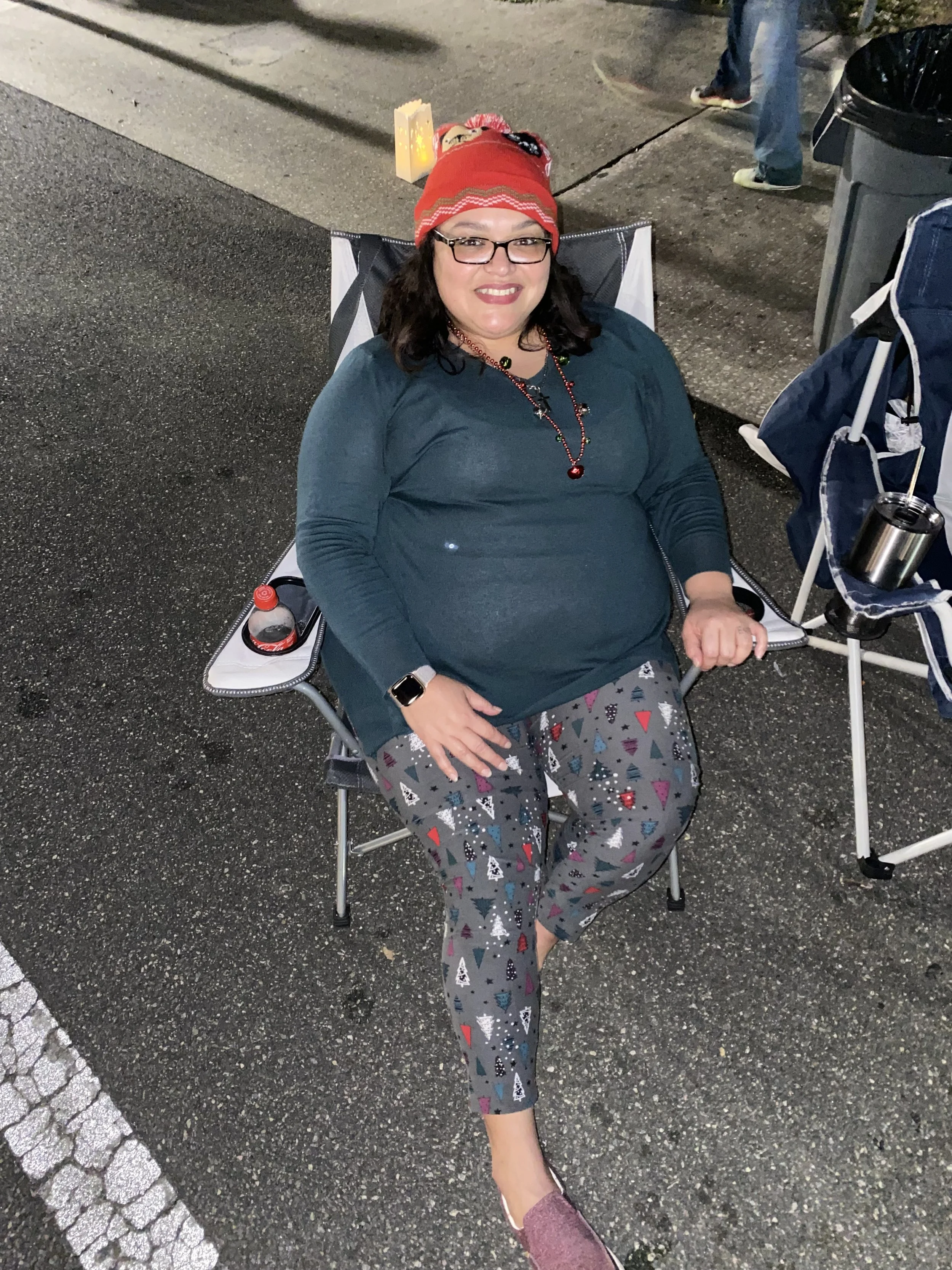 Person sitting in a foldable chair wearing a red beanie, glasses, and a dark-colored sweater with patterned leggings. There is a drink bottle on the chair's armrest and street background.