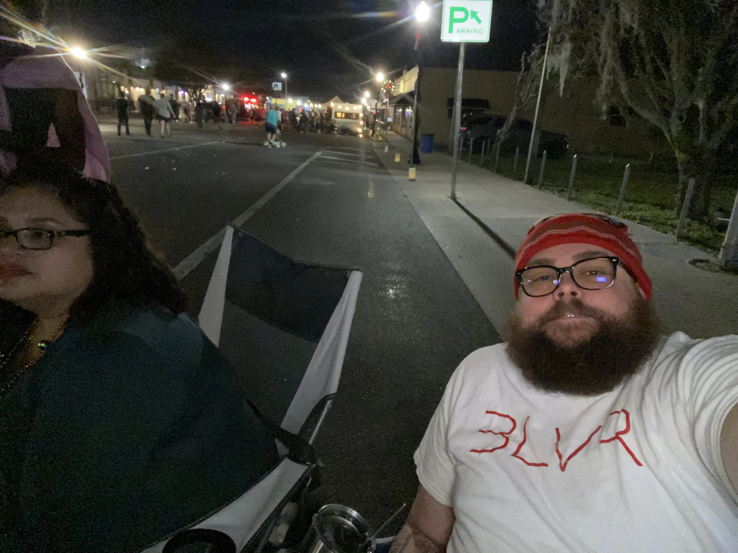 Two people sitting on chairs on a street at night, with a crowd in the background and a parking sign visible.