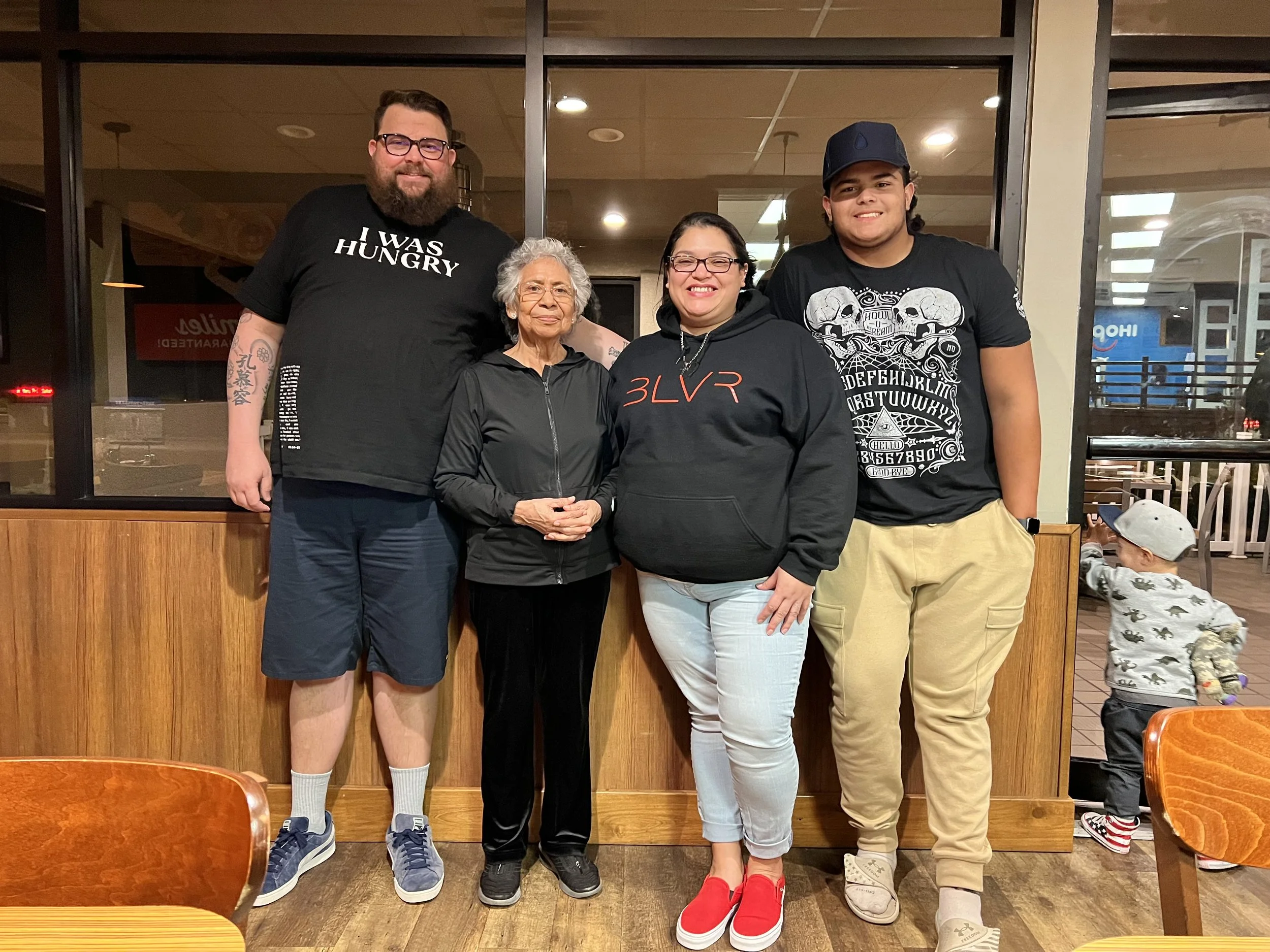 Group of four people standing in a casual restaurant, smiling at the camera, with a toddler on the right side looking out the window. Wooden furniture and interior visible.
