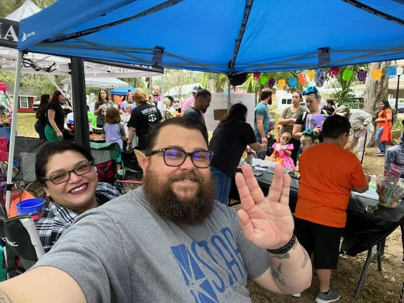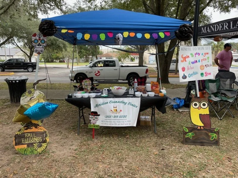 Outdoor booth setup under a blue canopy with decorations, including colorful skulls and an owl sign. A table displays various items and a sign reads 'Meridian Counseling Center.' There's also a 'Fall Blessings' sign and a 'Spin to win' game.