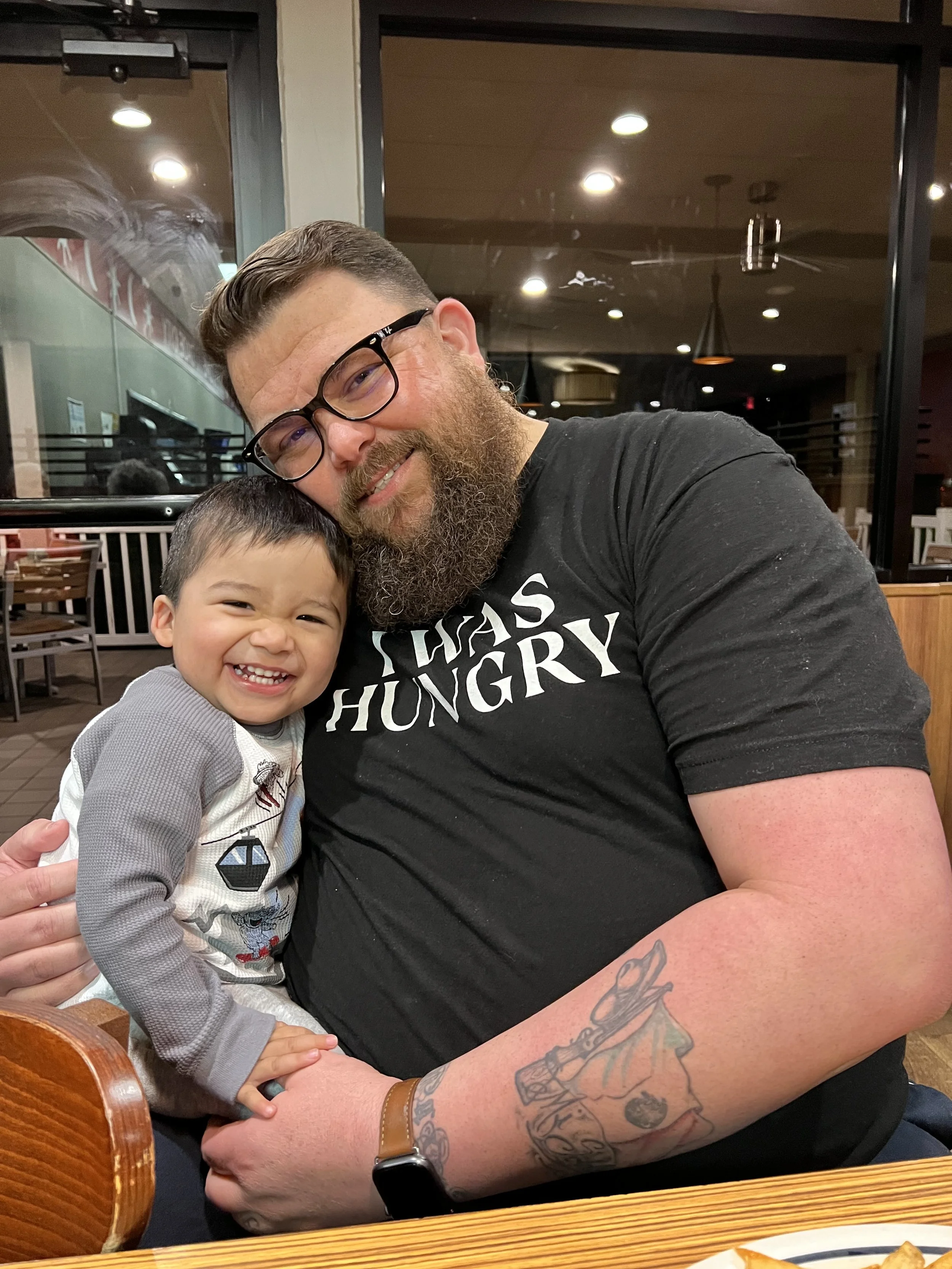 Man with a beard and glasses, wearing a shirt with text, and a child smiling while sitting together indoors at a dining table.