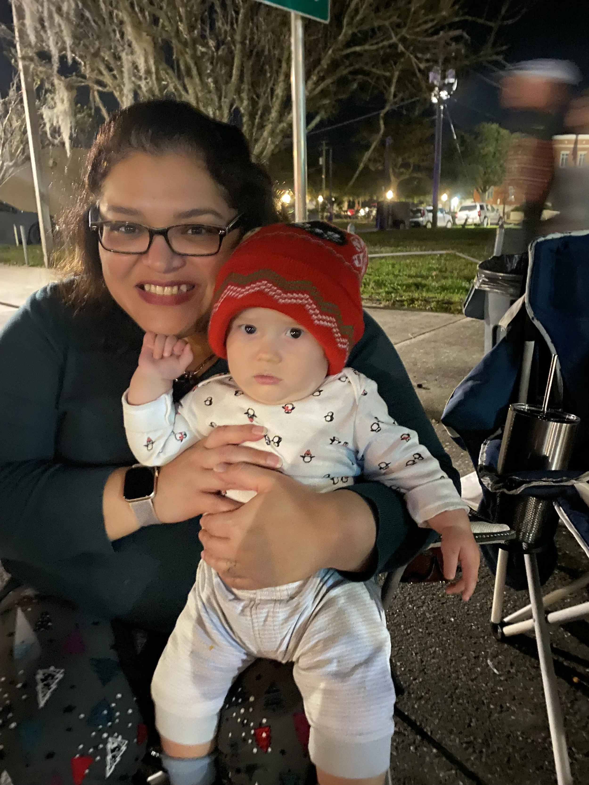 A woman holding a baby wearing a red knit cap and patterned pajamas, sitting outside at night with streetlights in the background.