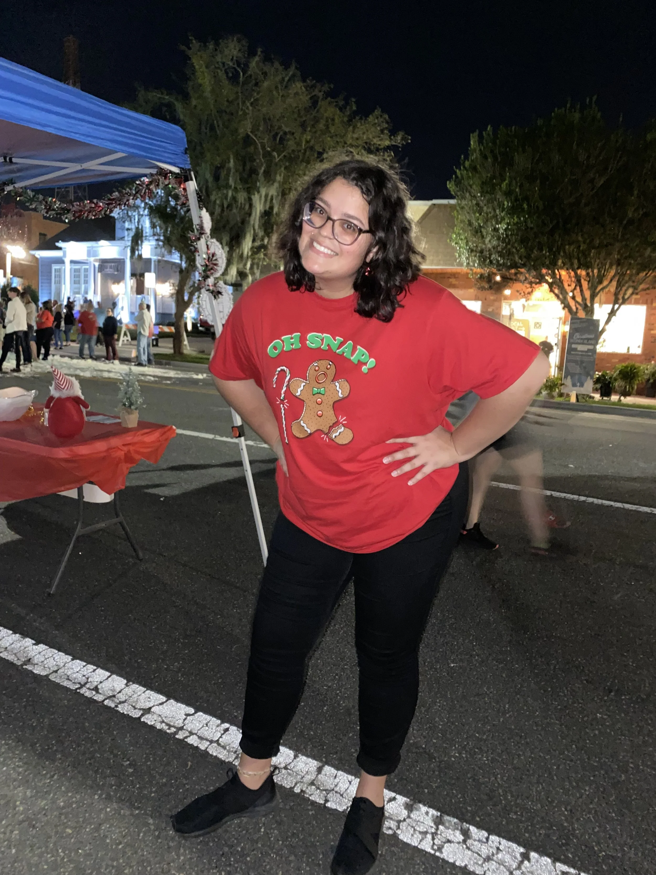 Person wearing a red "Oh Snap!" gingerbread-themed shirt and black pants, standing on a street at night near a festive, decorated booth.
