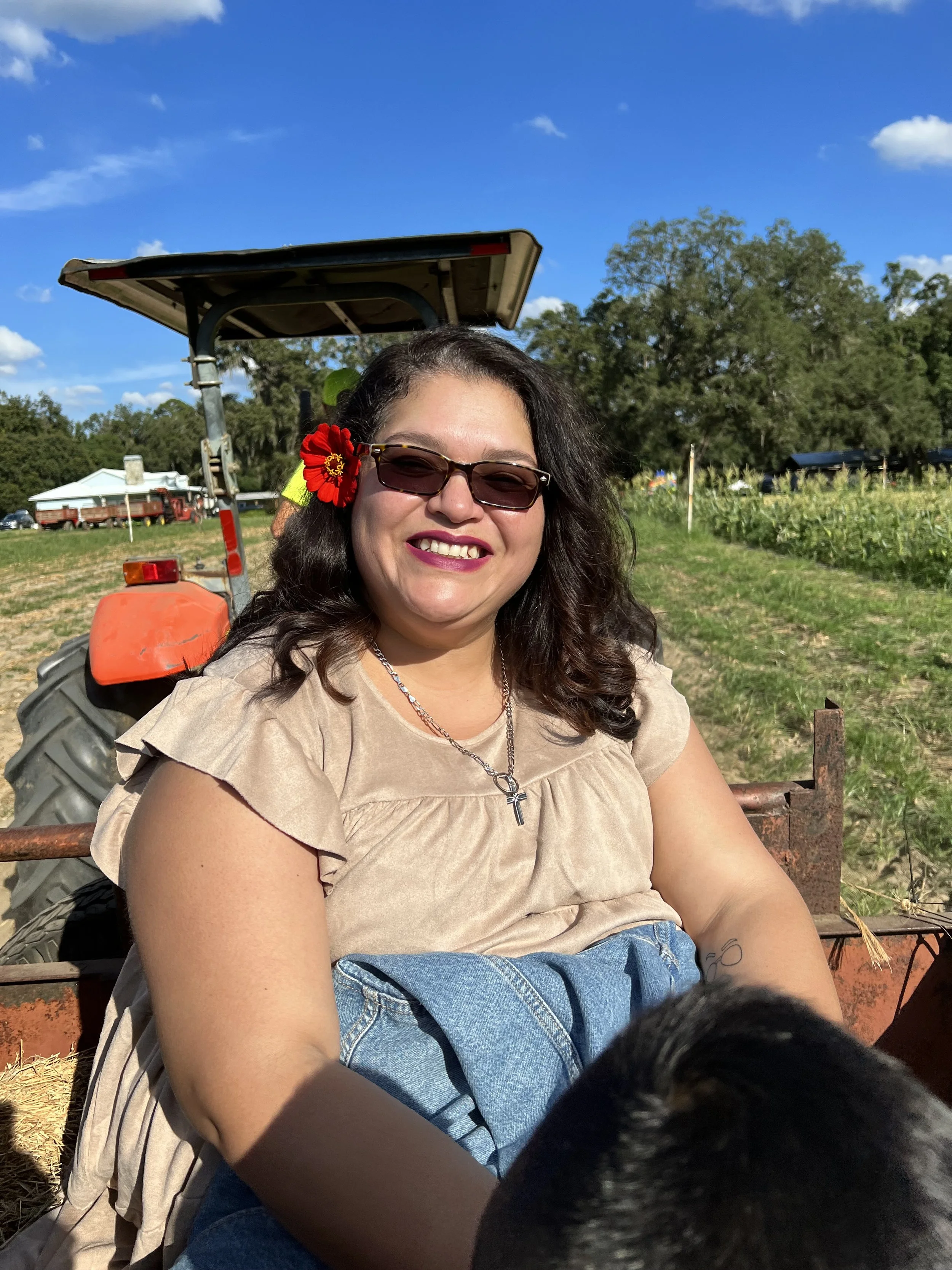 Smiling person with glasses and a red flower in their hair, sitting on a tractor in a farm setting under a blue sky.