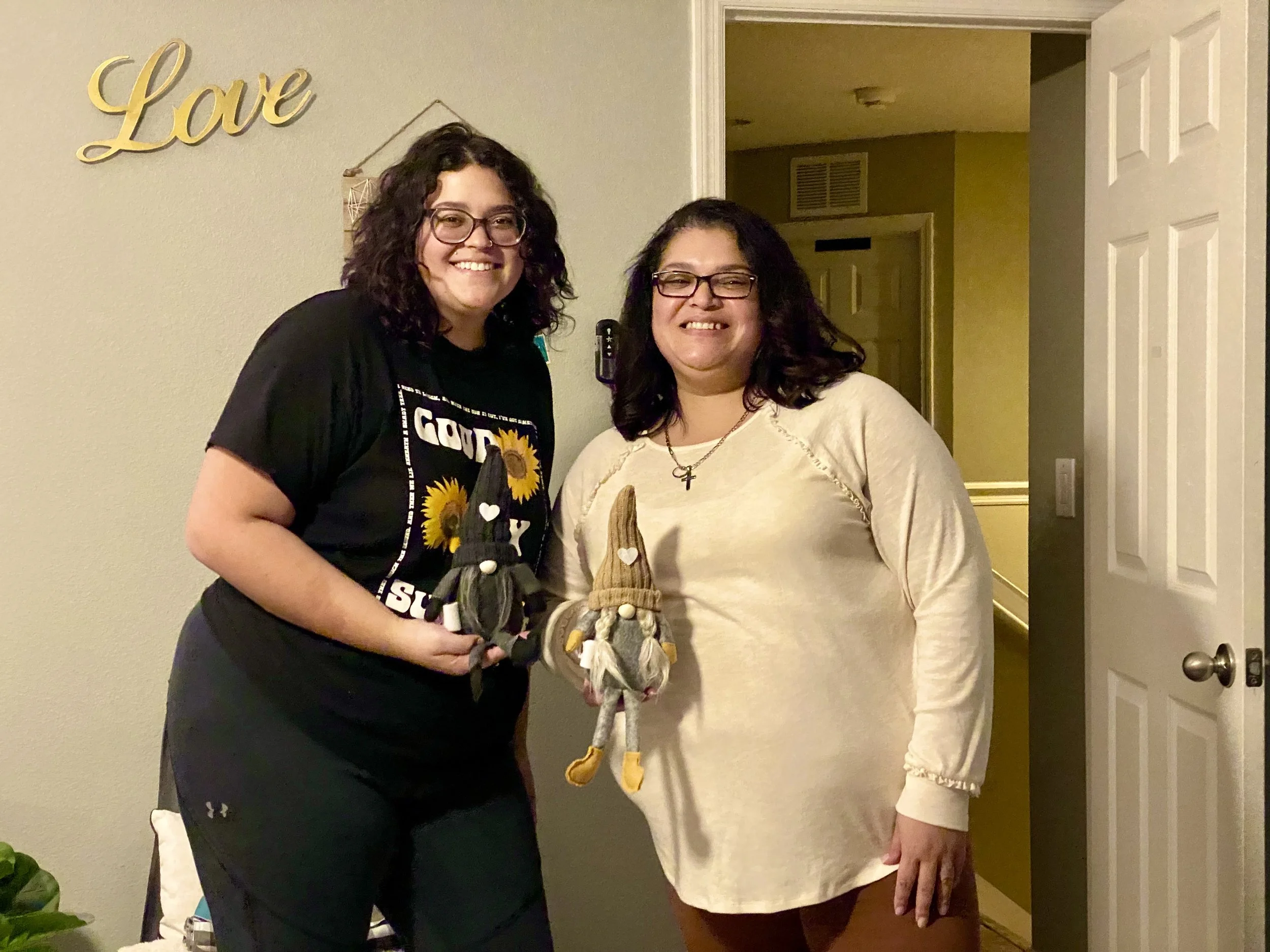 Two women standing in a room with wall decor featuring the word 'Love.' They are smiling and holding small decorative figures resembling gnomes. One woman is wearing a black shirt with sunflowers, and the other is wearing a cream-colored sweater. The