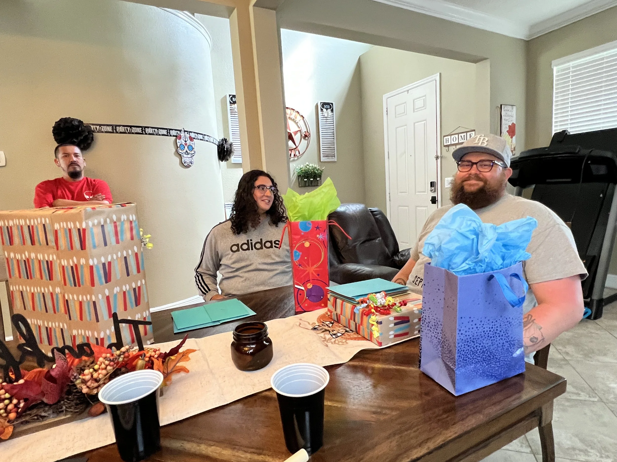 Three people sitting around a table with wrapped gifts and decorations, including a large present and bags with tissue paper, in a room with a skull banner on the wall.