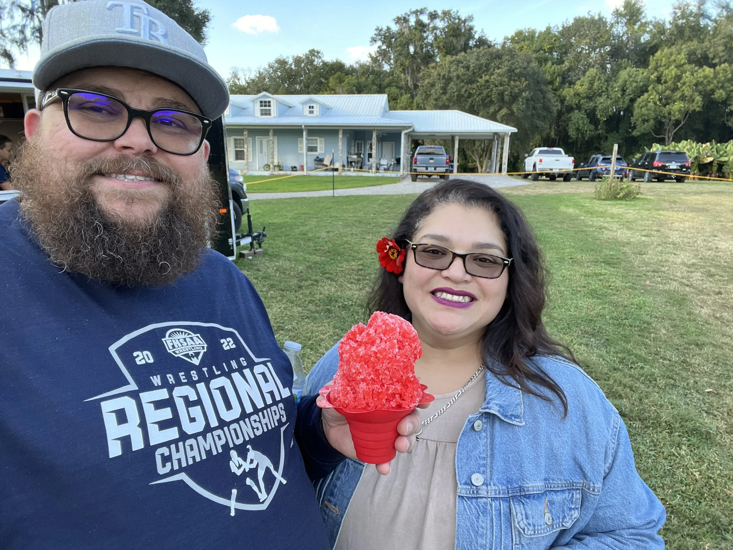 Two people outdoors, one holding a red snow cone, smiling. There is a grassy lawn, house, and parked cars in the background. The person on the left wears a cap and glasses, and the person on the right has a flower in their hair.