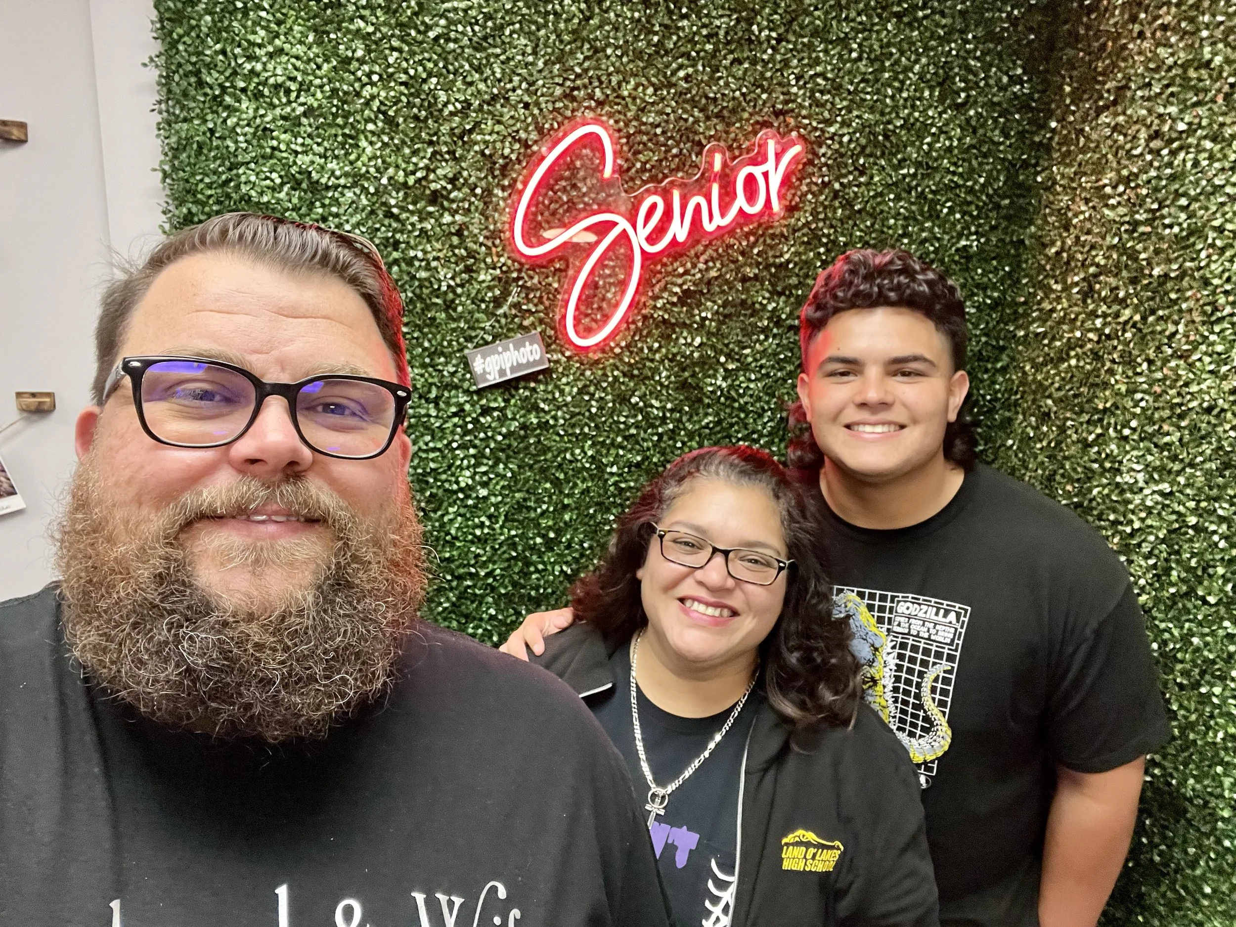 Three people smiling in front of a greenery wall with a neon sign reading "Senior."