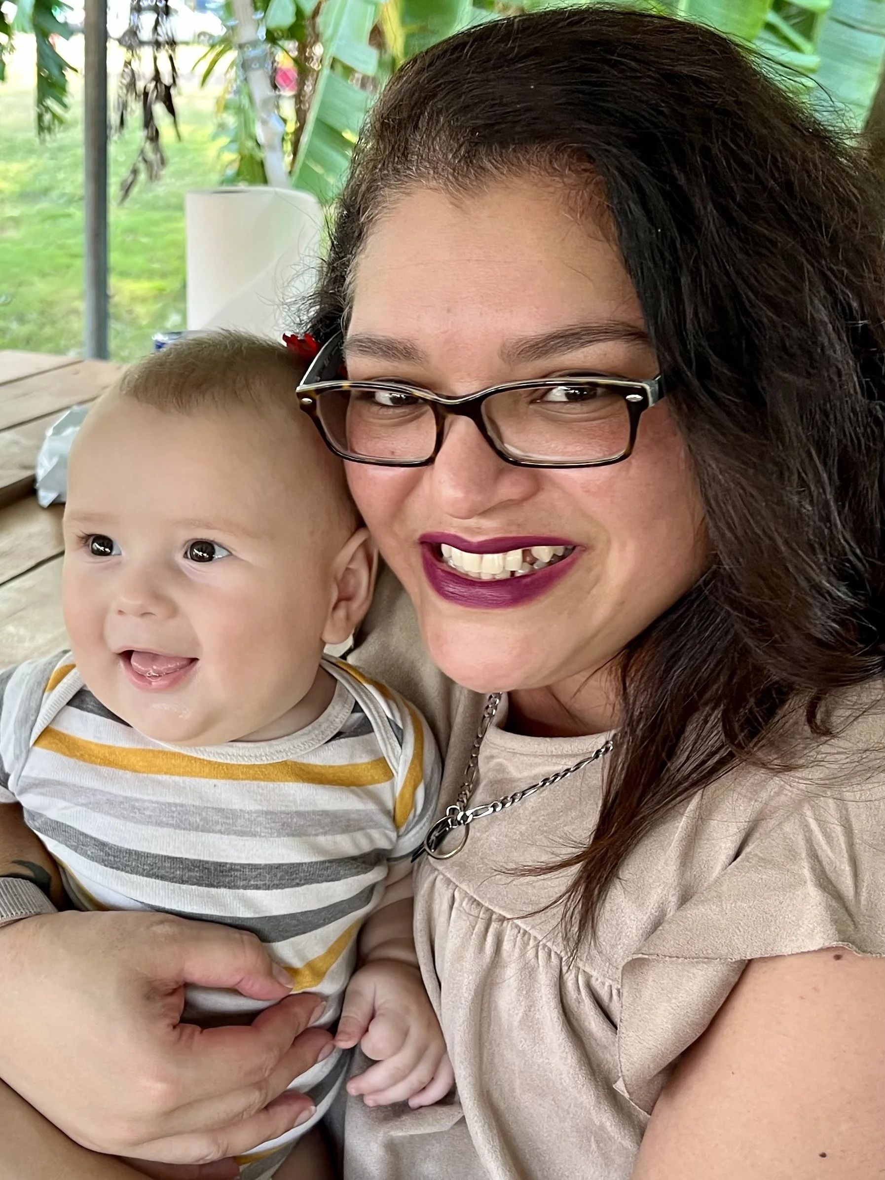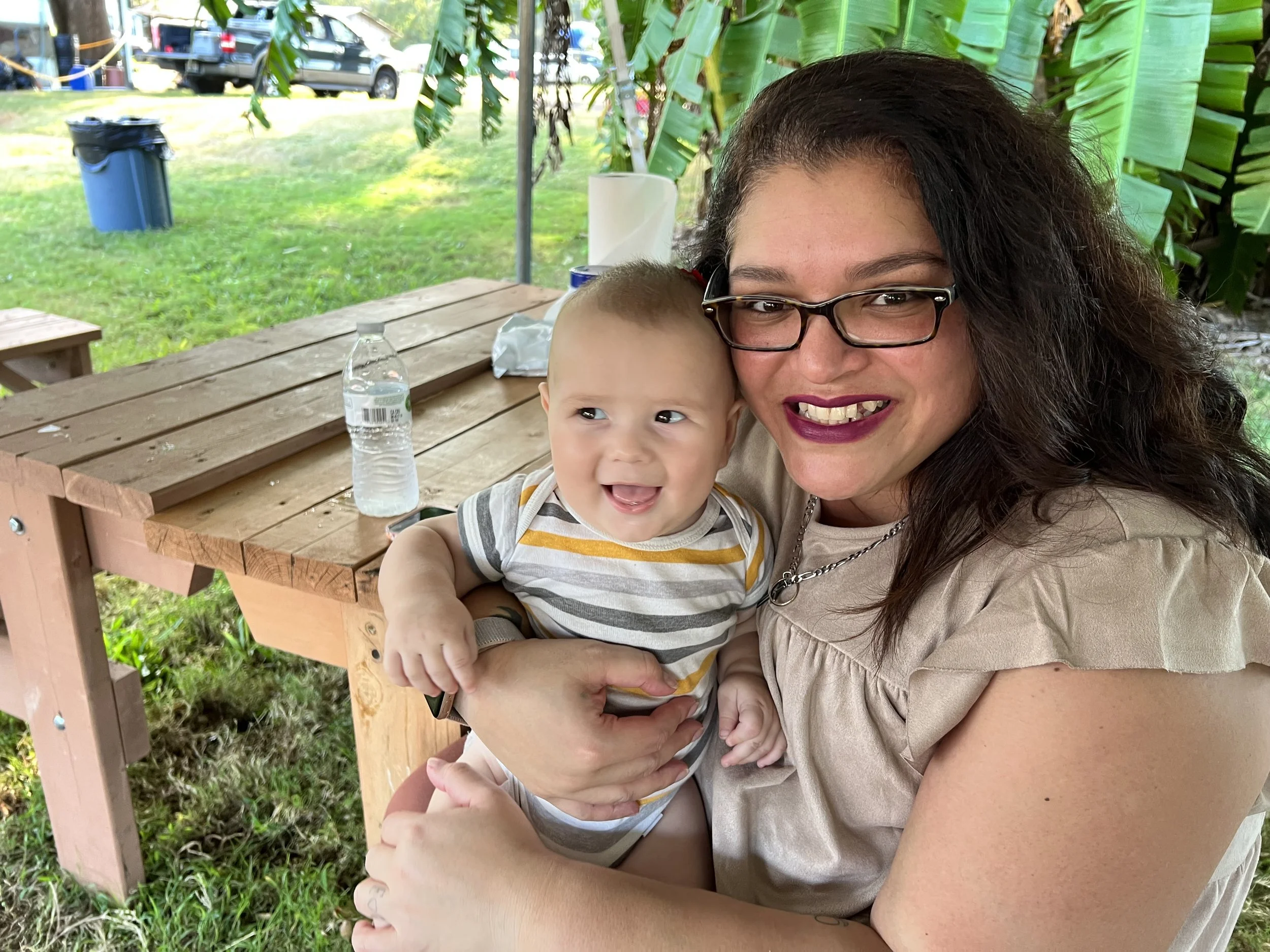 Woman with glasses happily holding a smiling baby outdoors near a picnic table with greenery in the background.
