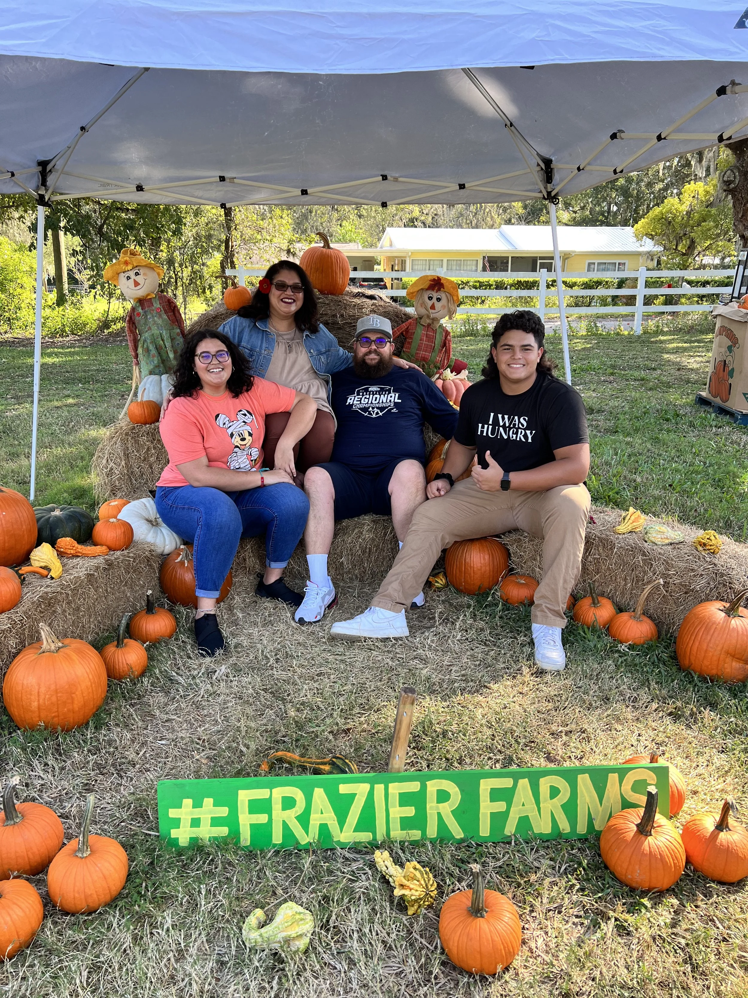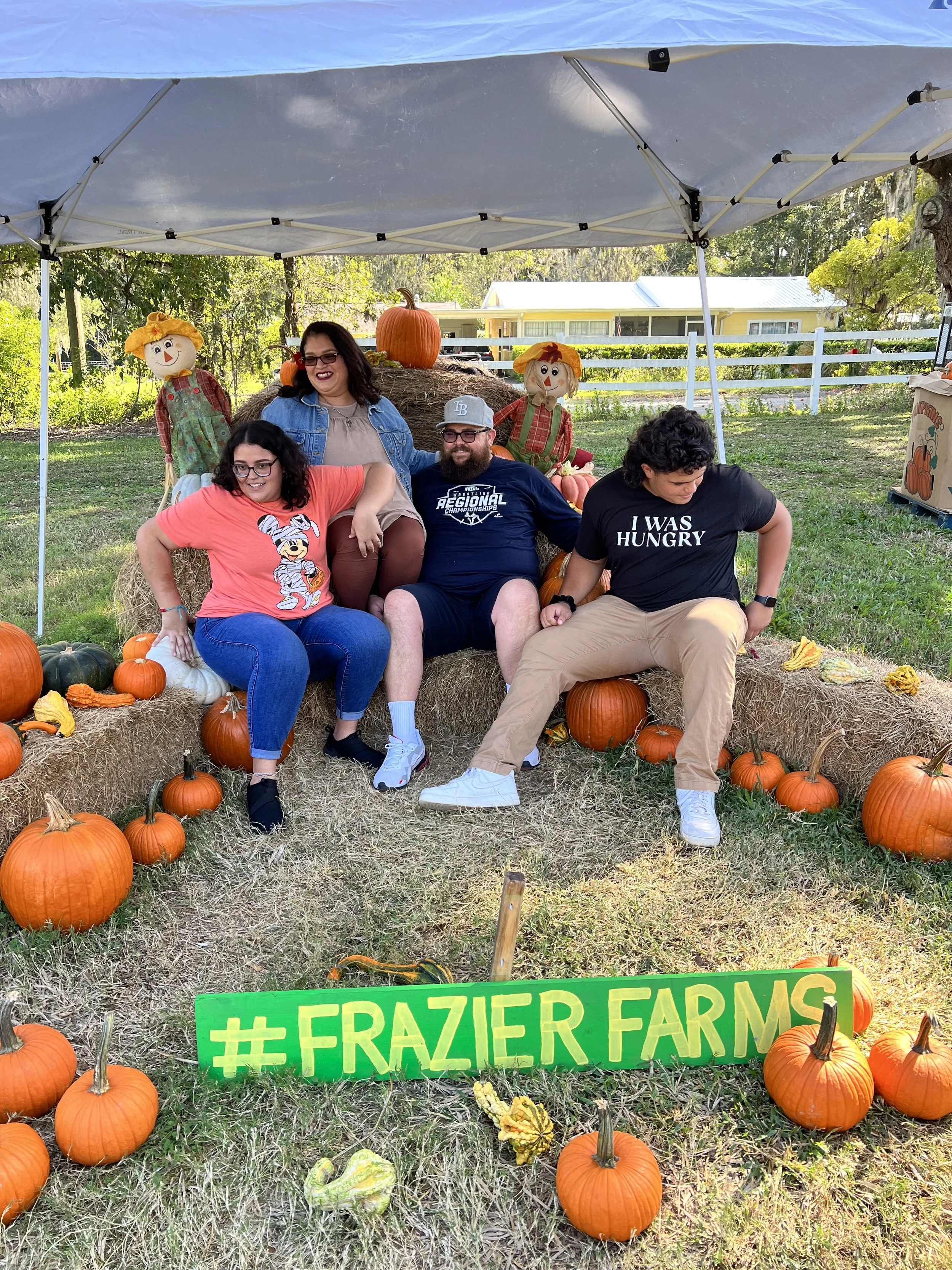 Four people sitting on hay bales under a canopy at a pumpkin patch. They are surrounded by pumpkins and decorative scarecrows. A green sign in front reads '#Frazier Farms.'
