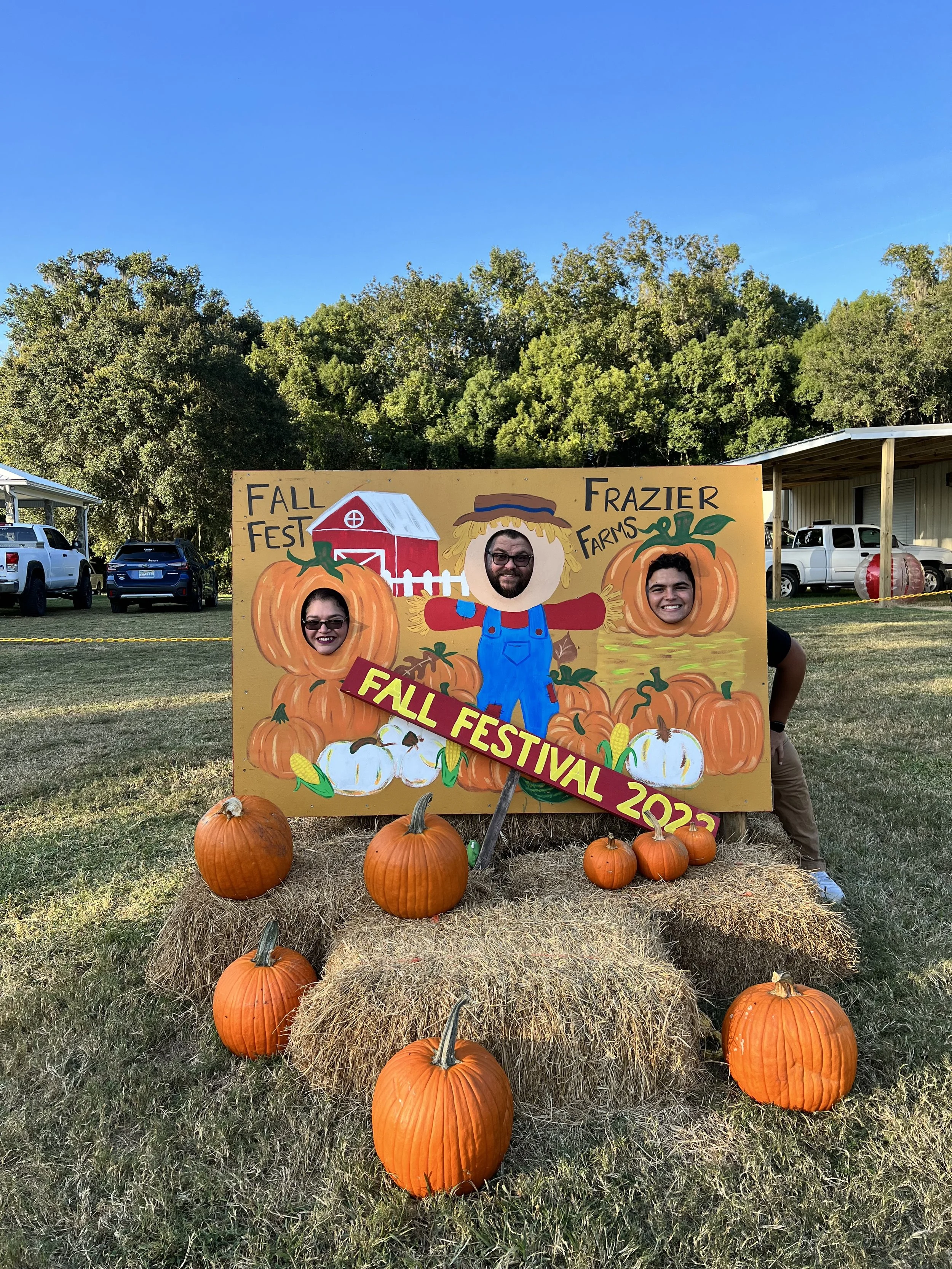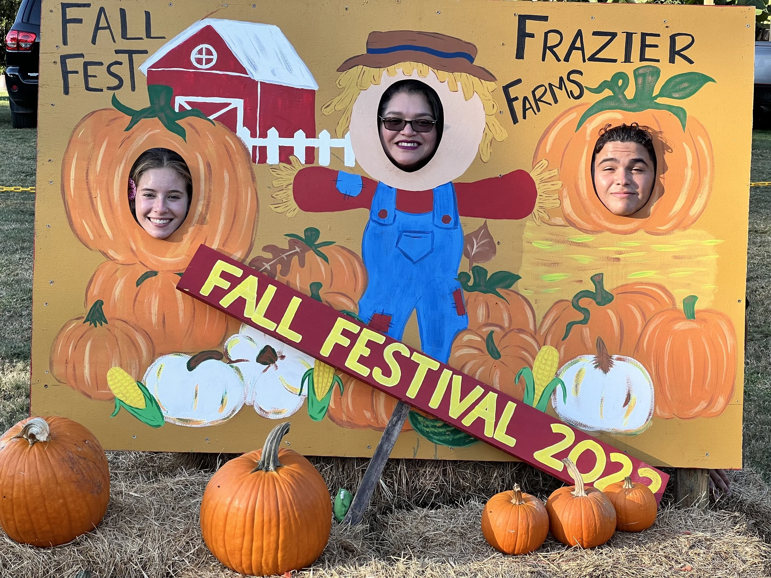 Three people posing with their heads through cutouts in a painted fall festival sign at Frazier Farms, surrounded by pumpkins and hay bales, with trees and parked vehicles in the background.