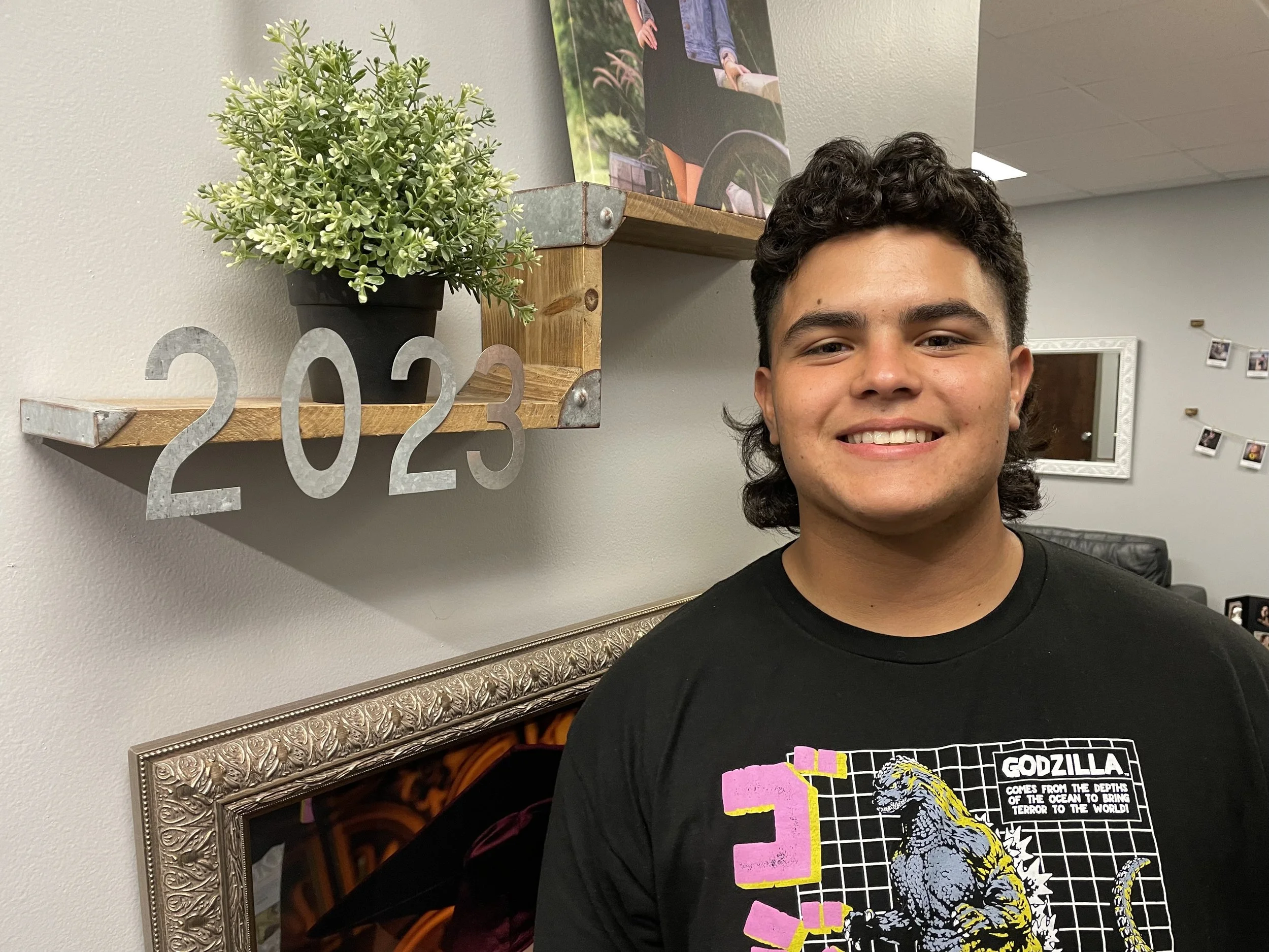 Smiling person next to a shelf with "2023" and a small plant, wearing a Godzilla t-shirt, in a room with framed pictures and wall decor.