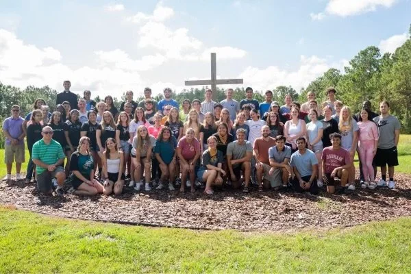 A large group of people posing outdoors in front of a cross in a grassy area.