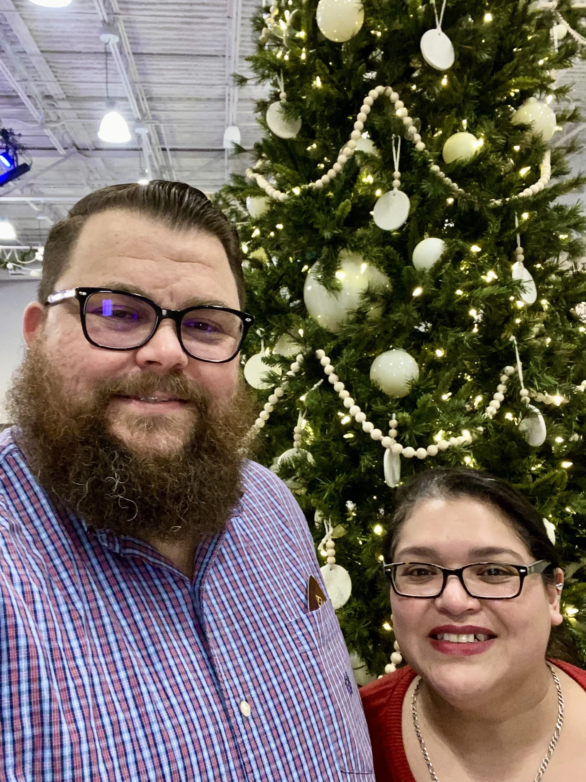 Two people smiling in front of a decorated Christmas tree with lights and ornaments.