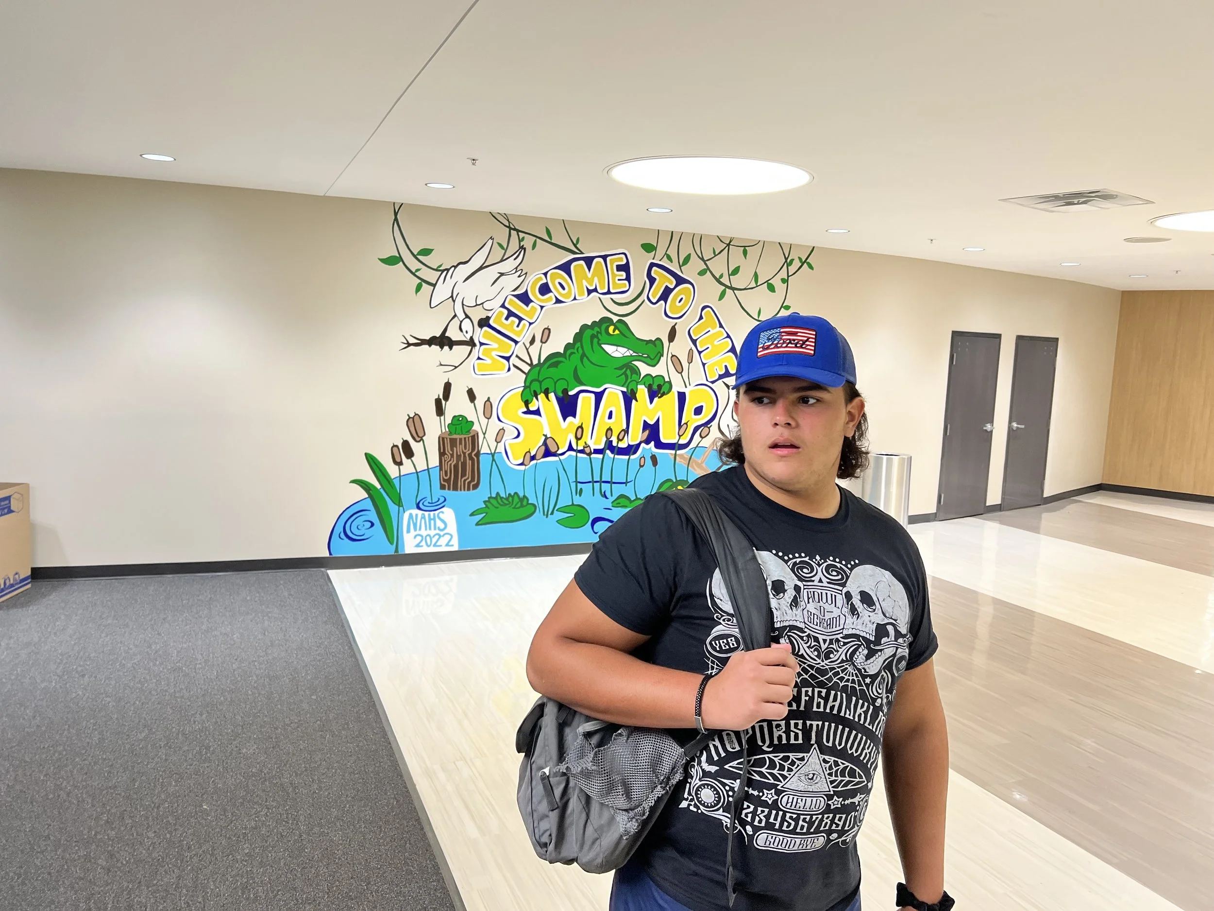 A young person wearing a blue cap and graphic black t-shirt stands in a hallway with a mural reading "Welcome to the Swamp" depicting a swamp scene with an alligator and egret, marked with "NAHS 2022."