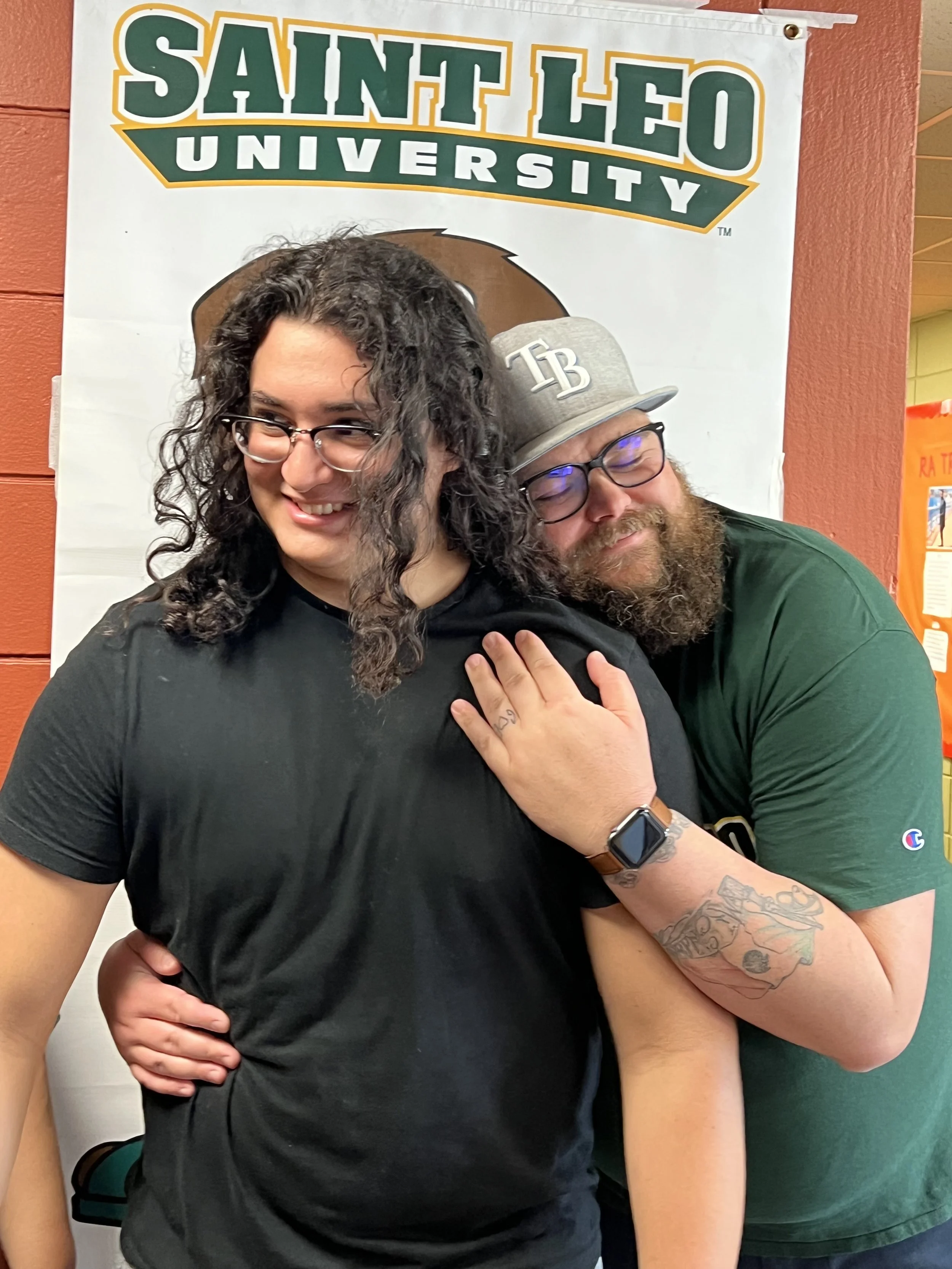 Two people hugging in front of a "Saint Leo University" banner. One person has long hair and glasses, the other is wearing a cap and glasses. Both are smiling. Tattoos and a smartwatch are visible.