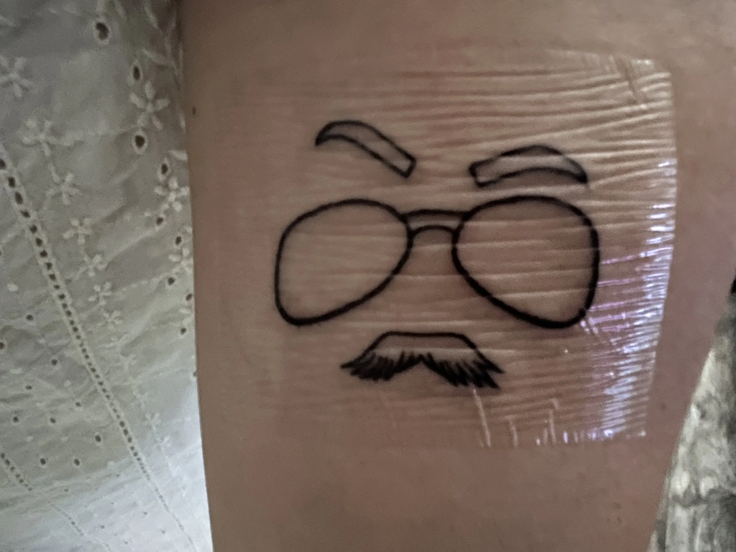 Minimalist tattoo of glasses, eyebrows, and a mustache, covered with protective film on skin.