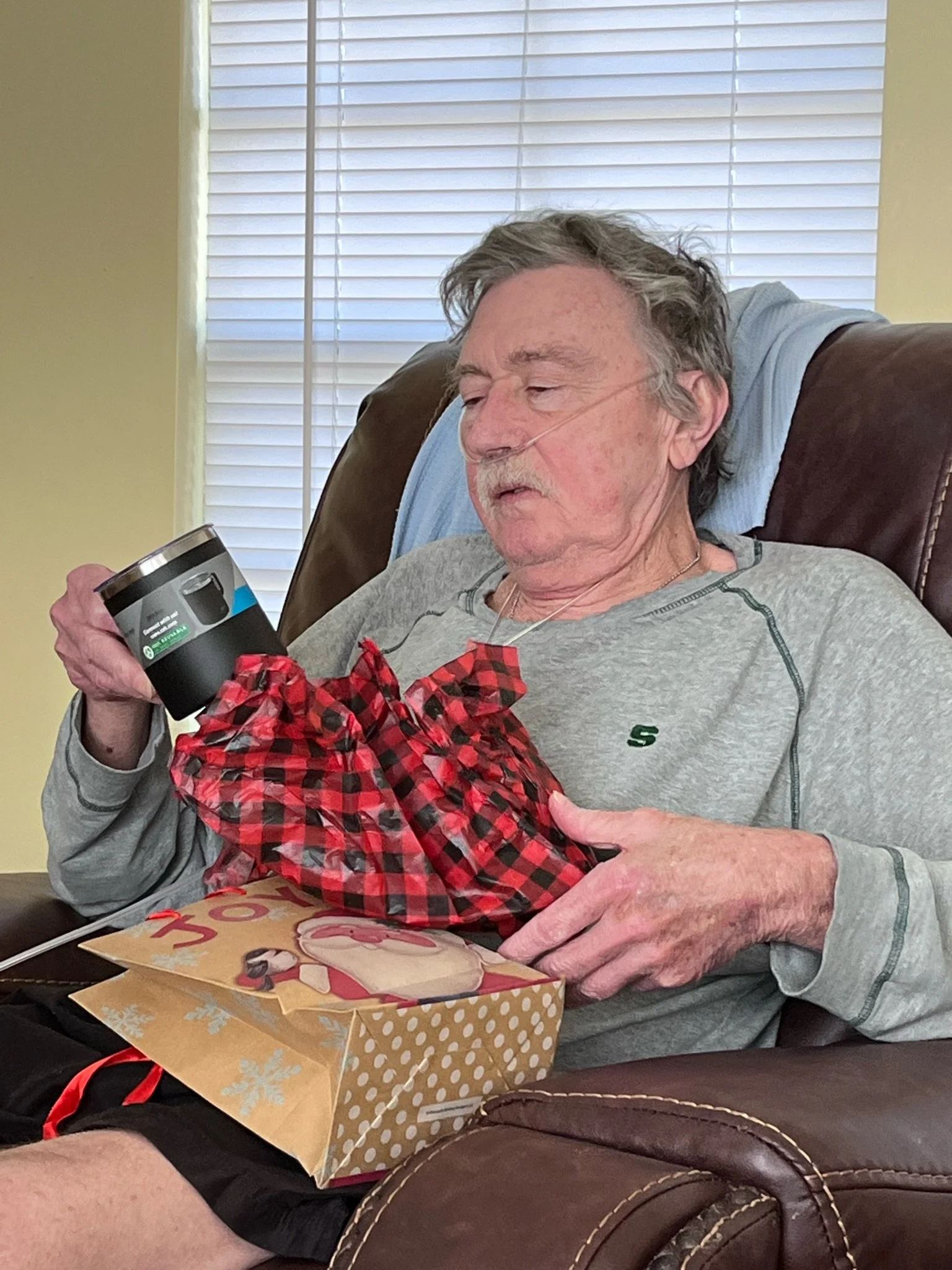 Older man with nasal cannula opening a Christmas gift in a living room.